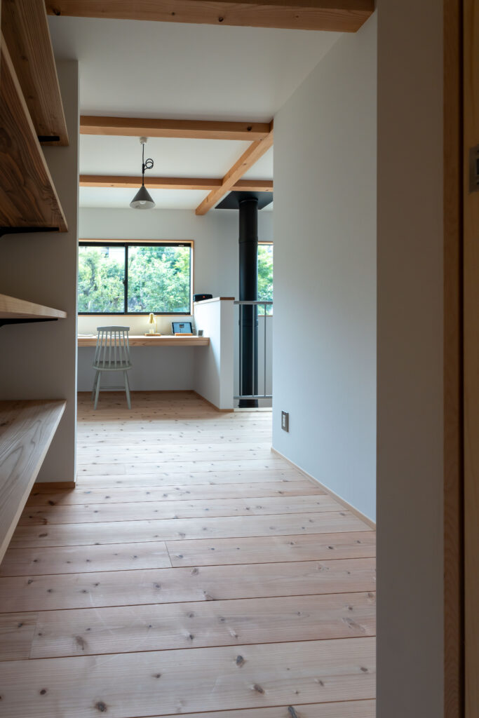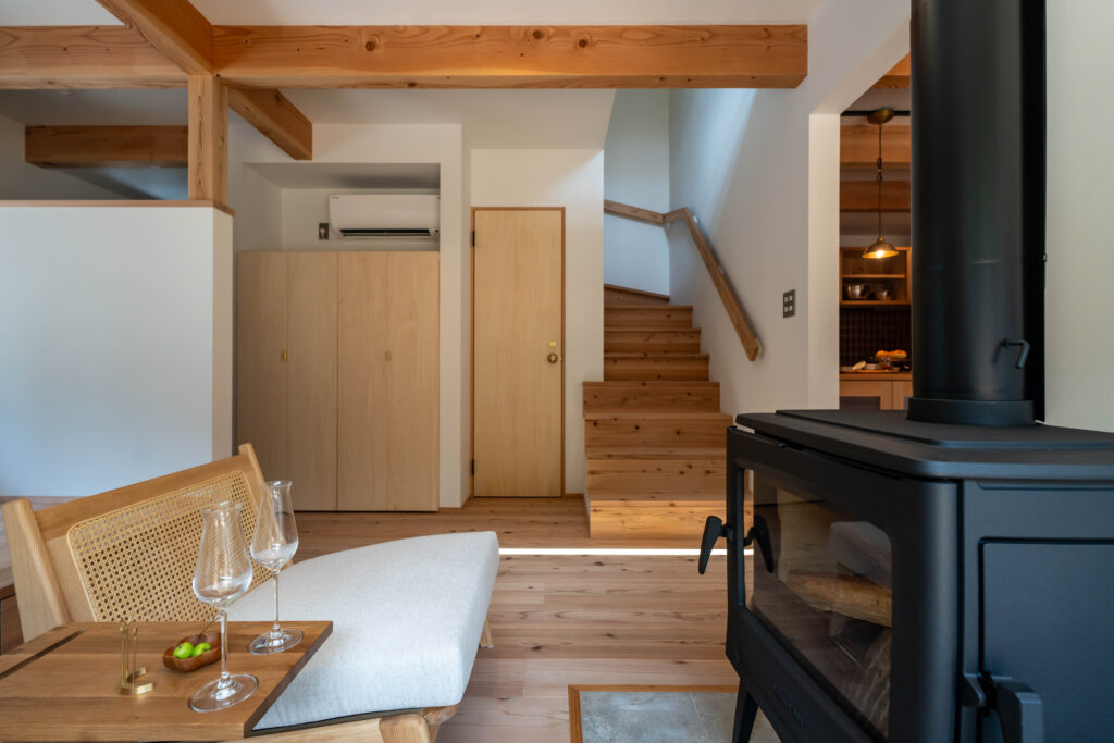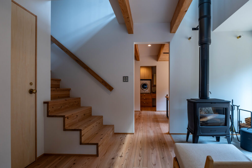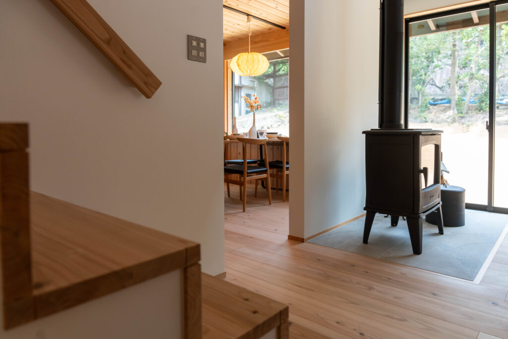 玄関から進むとすぐに薪ストーブのあるリビング。