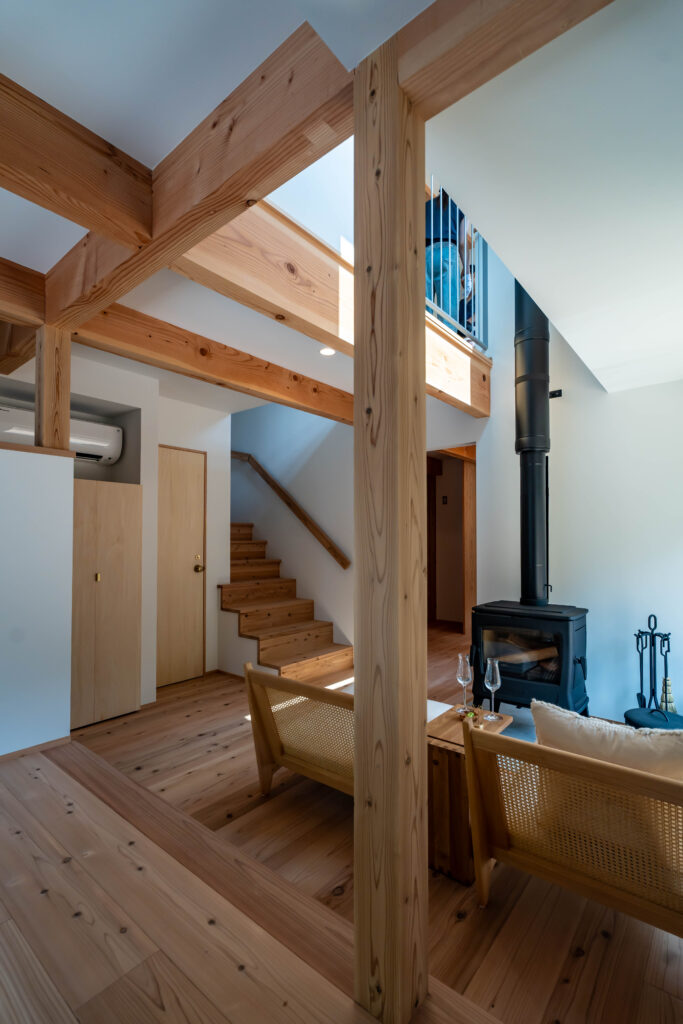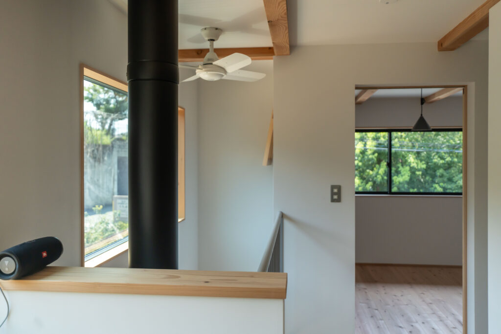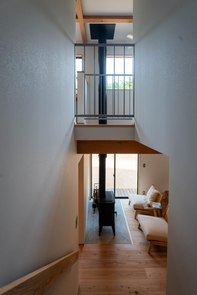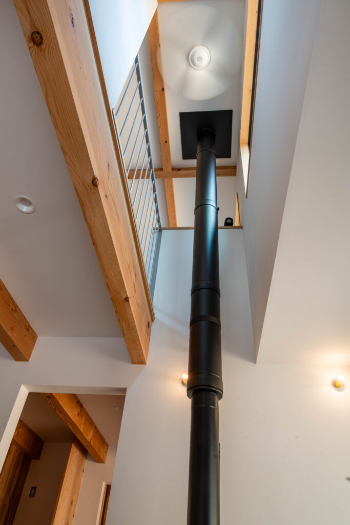 吹抜けを通る薪ストーブの煙突は存在感があります