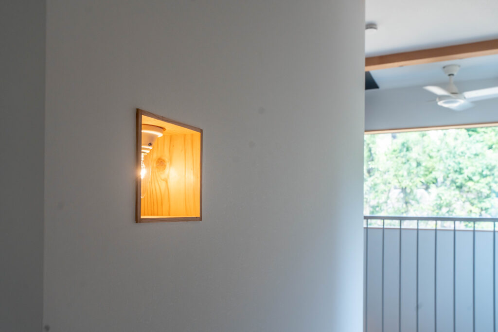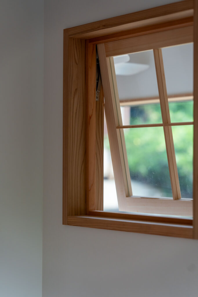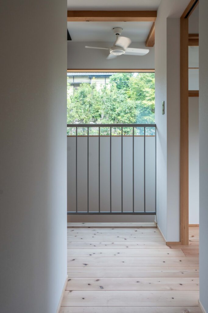 吹き抜けに面した室内窓で空間に緩やかにつながりを持たせます