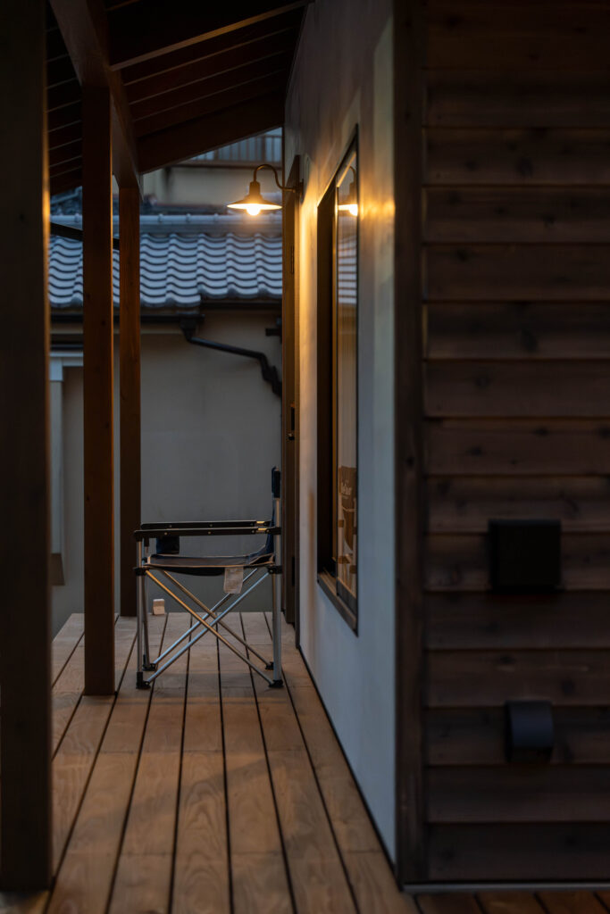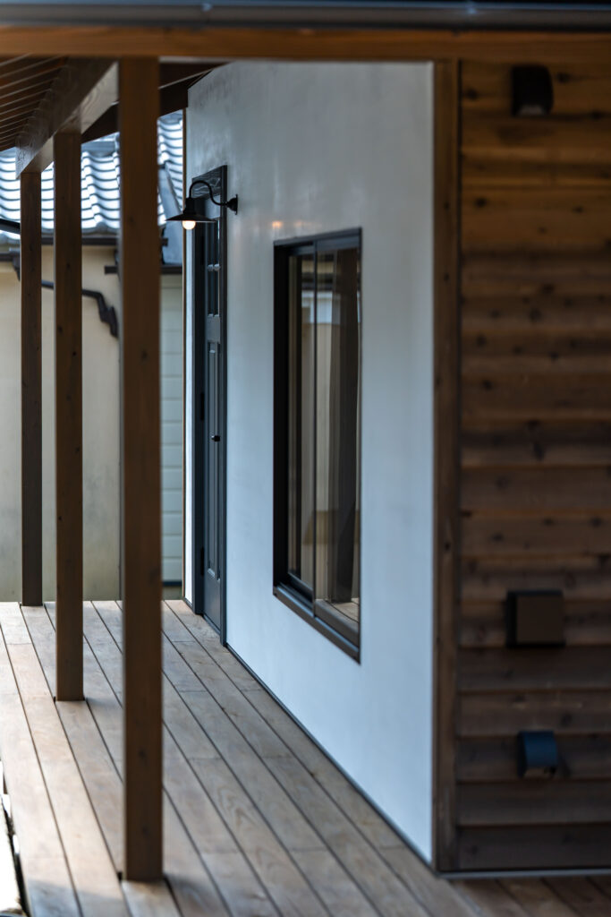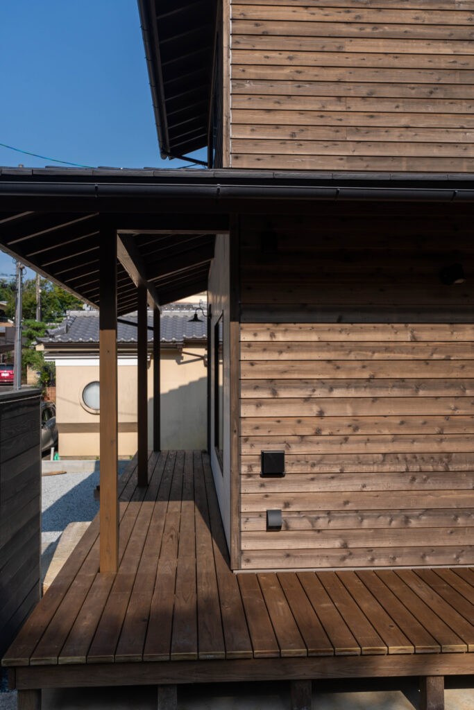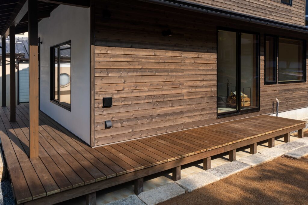 ウッドデッキはリビング横から玄関まで回りこむように作っています。