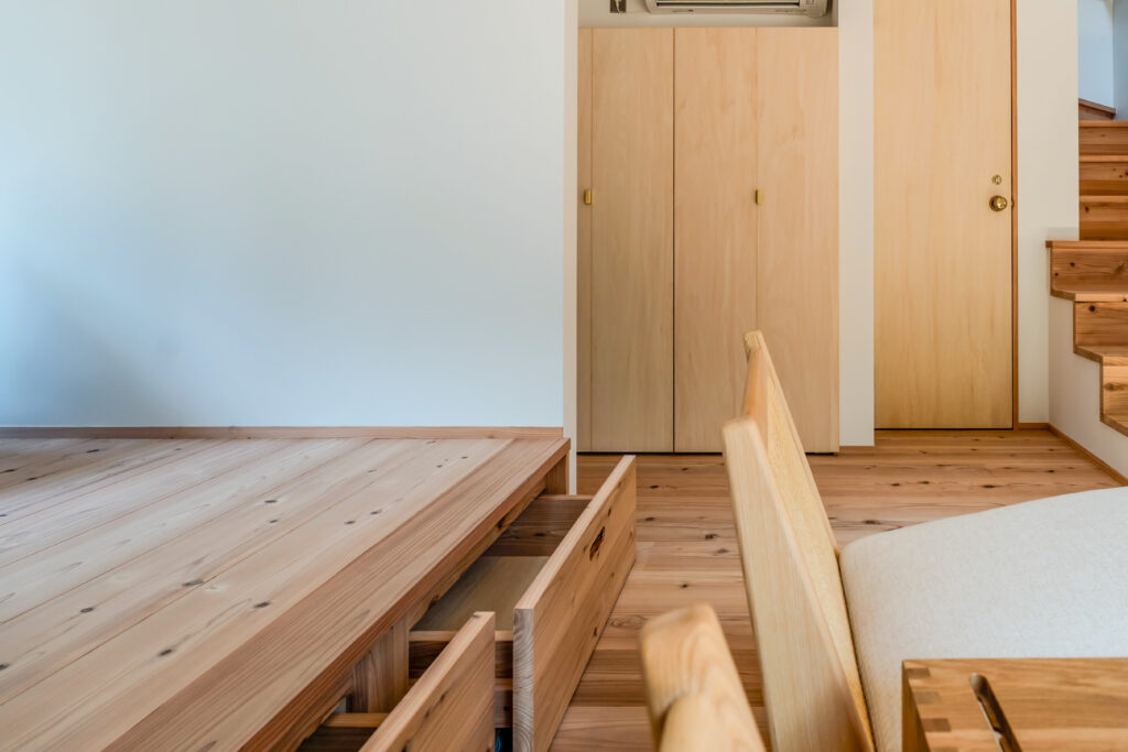 薪ストーブの対面には小上がりもあり、下には収納スペースも。