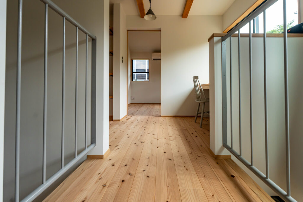 渡り廊下のような2階廊下とフリースペース