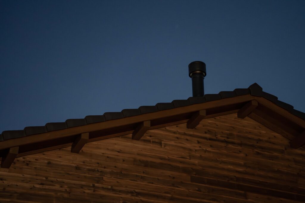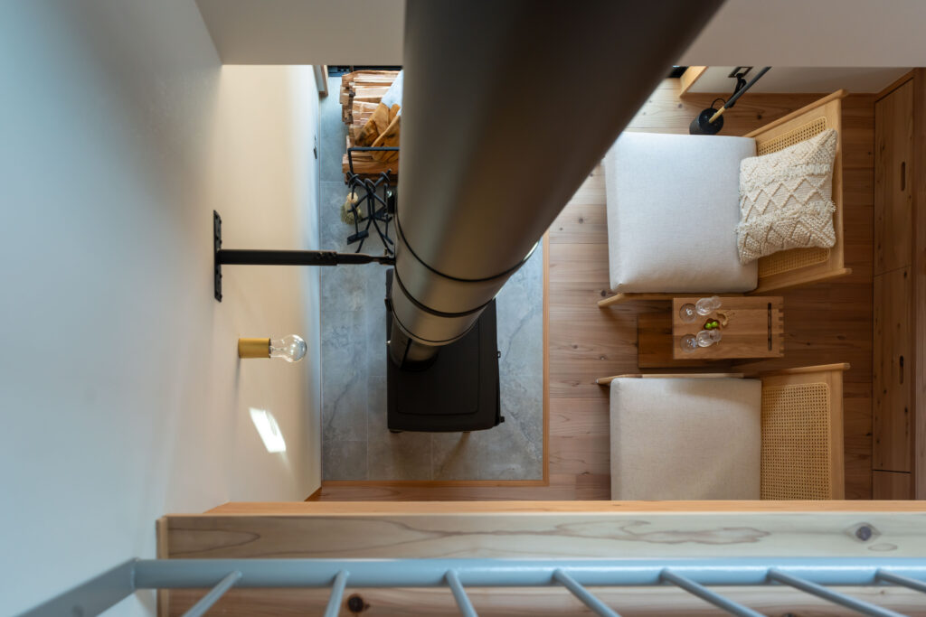 階段途中で振り返ると薪ストーブの煙突が伸びているのが見えます。