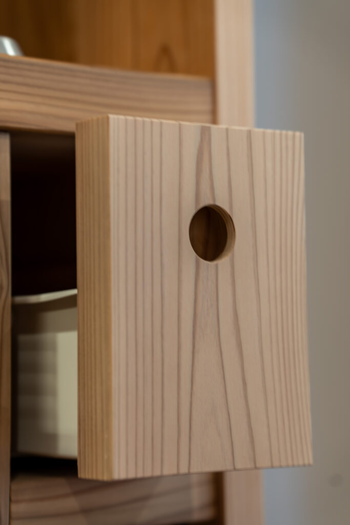 引出しは穴の中が入口の径より大きく、指先がひっかかるようになっています。